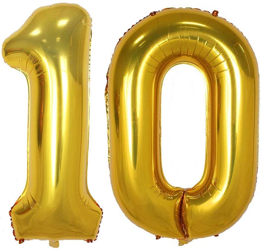 Foil Helium balloon, empty balloon is 42 inch, after filled with helium or air, its 40 in 10 balloon, Gold number 10 foil mylar balloon Large number 10 balloons, 40 in tall helium number balloon Happy Birthday Decorations, inflated with helium or air, use straw or air pump, straw included Number 10 Mylar Balloon is perfect for decorating a birthday party or 10 years anniversary, birthday party decorations Jumbo foil balloon 10 gold, Can be repeated use, convenient inflation and deflation