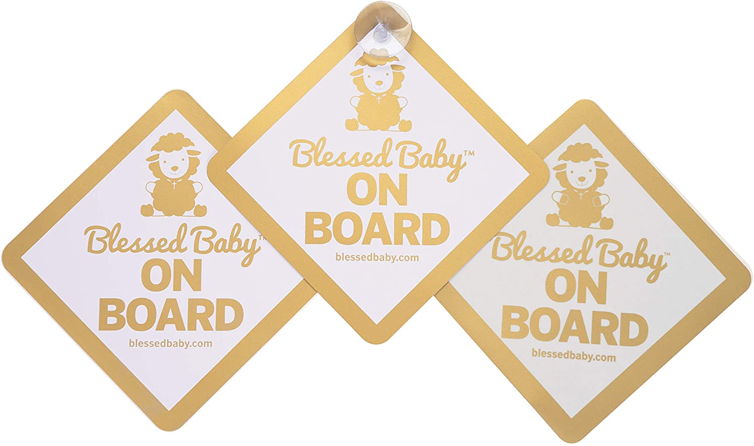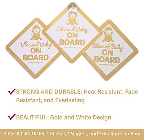 The Blessed Lamb – Blessed Baby On Board Signs for Cars – Gold and White 3 Pack, Car Suction Cup, Car Sign Sticker, Magnetic Sign for Cars – Religious Gifts, Godmother Gifts, Christian Gifts