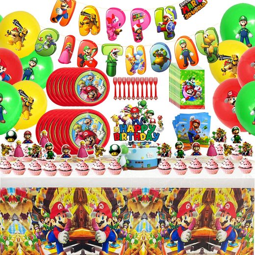 I hope you can enjoy all this and bring a good memory to you and your children. Mario Bros Themed Birthday Party Decoration, Mario Birthday Party Supplies Includes Banner, Plates, Forks, Cake Topper, Cupcake Toppers, Napkins, Tablecover, Balloons Party Mario Decorations Kit About The Super Cute Mario Bros Party Kit: Package Include: 1*Happy Birthday Banner, 1*Cake Topper, 24*Cupcake Toppers, 20*Napkins, 10*7inch Plates, 10*9inch Plates, 10*Forks, 1*Tablecover, 18*Balloons.