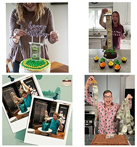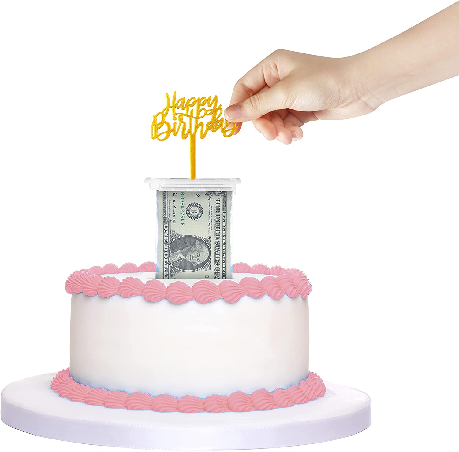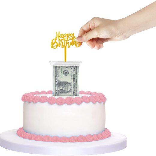 The Money Cake – Cake Money Pull Out Kit includes special box, 1 plastic roll (50 connected pockets), Happy Birthday Topper
