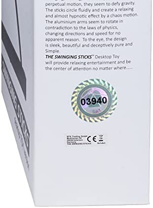 SLEEK, SOPHISTICATED DESIGN: The Swinging Sticks Kinetic Energy Sculpture seemingly defies gravity as the double pendulum creates a fluid, relaxing rotation designed to change speeds and direction for no apparent reason. This high-quality, museum-style motion sculpture gives the illusion of perpetual motion designed to baffle and amaze all onlookers. Hand assembled by experienced engineers. Designed in Germany. BEAUTIFUL ART: Perfect for any environment, The Swinging Sticks is ideal for conference rooms, offices, waiting rooms, display windows, and foyers. This sculpture will provide relaxing entertainment and be the center of attention no matter where you palce it. HOW IT WORKS: Powered by 4 AA batteries (not included), the aluminum sticks revolve in a mysterious, perpetual motion, creating an entertaining hypnotic effect. Inspected and tested for 7-10 days. Only products that live up to the highest quality requirements will be shipped. Includes 2 year manufacturer warranty against defects. NEVER-ENDING: The Swinging Sticks Desktop Toy is a double pendulum kinetic energy perpetual motion desk sculpture. Continuously rotating, it is designed to remain in motion unassisted. The constant, fluid movement is designed to appear like the sculpture is changing speeds and directions. QUIET: A beautiful piece of art, this kinetic sculpture operates nearly silent and is well recommended for quiet office and medical environments. A small tick sound may be heard at a very low volume.