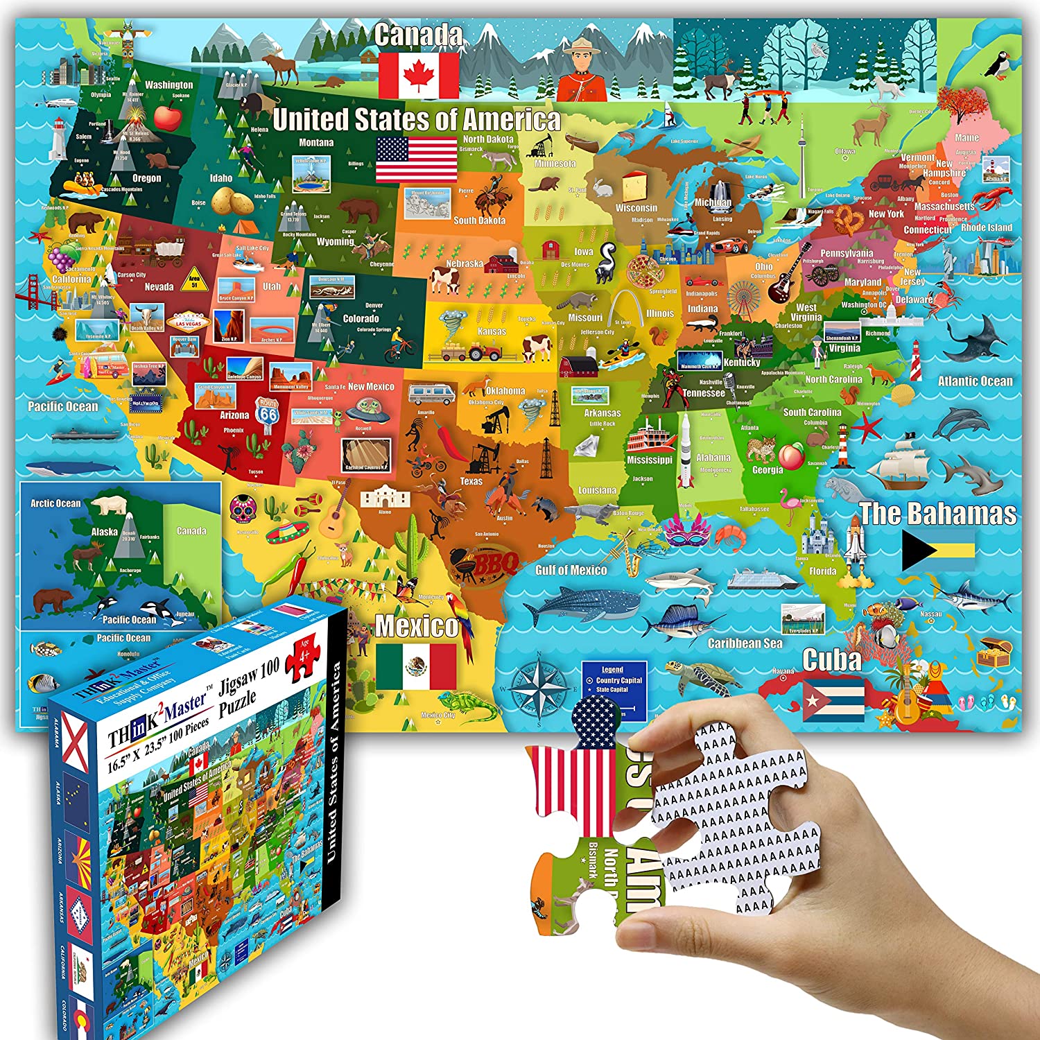 Think2Master Colorful United States Map 100 Pieces Jigsaw Puzzle Fun Educational Toy for Kids, School & Families. Great Gift for Boys & Girls Ages 4-8 to Stimulate Learning of USA. Size:23.4u201d X 16.5u201d