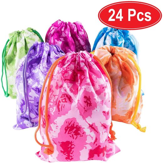 The perfect birthday party ideas for toddler candy bags. Place a variety of candy inside and create a fun dessert table while pairing fabric fake leaves and grass table skirt for a safari decoration! These bags are light weight, durable and re-usable. Have them for birthday party supplies or your baby shower decoration kit to create the most festive event for your friends and family. Pair them with party invitation cards, pinatas for birthday partys, use as wall decorations and other safari decor. The equipped nylon drawstring closure design helps you store things quickly and take them in and out easily. Comes in a package of 24 tie-dye drawstring bags in camo pattern. Colors include: orange, green, blue, purple, pink, pink/red. With 4 of each color included in every purchase. Make them birthday party favors for a go-to choice for party decorations hawaiian style! These high quality, light weight camo color gift bags are reliable, and great for filling with small keepsakes, candies, small toys or novelty items for birthdays. You can even have kids and adults create personalized drawstring tote bags at birthday partys, easter baskets and give them as party favor kids goodie bags. Great to decorate with friends and family at home during a family night of arts and crafts. Go beyond the ordinary and have fun craft activities. Each bag measures 7 inches wide x 10 inches long. These cotton tie-dye bags easily holds a cellular phone, small electronics, a water bottle, keys, and snacks!