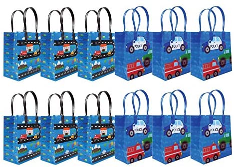 Tiny Mills Cars Fire Trucks Transportation Party Favor Bags Treat Bags with Handles, Birthday Party Goodie Bags Candy Bags for Toddler Birthday Party, Pack of 12