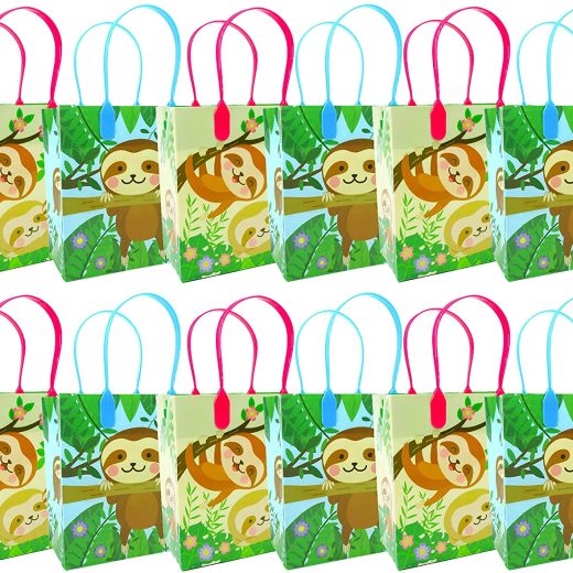 Looking for a sloth themed party favor bag Our goody bags are perfect for any celebration! The treat bags are super sturdy and the handles will not break! Each bag measures appx 7 inches tall, 6.25 inches wide, 3 inches deep. Use them at birthday parties, Easter egg hunts, baby shower, church festivals and more!