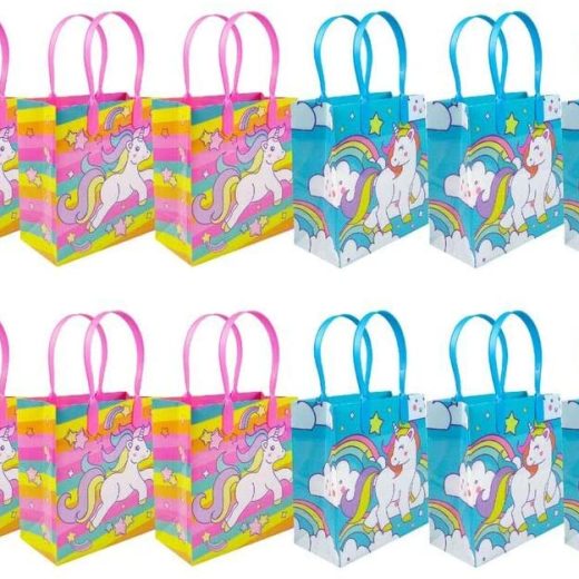 Tiny Mills Unicorn Party Favor Bags Treat Bags with Handles, Unicorn Rainbow Pink Blue Candy Bags Goodie Bags for Birthday Party, Party Supply Decoration, 12 Pack