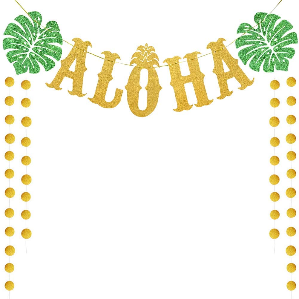 Fabulous Luau Party Banner For Your ALOHA Hawaii Luau Party Decorations :want to have an eye-catching luau partyYou cant forget to buy our specail Hawaiian party banner.The banner comes comes pre-strung with gold rope and help you save more time.The only thing you need to do is to find a right place for the banner to hang. Shiny Material For Aloha Party Supplies:The large gold Aloha banner is made of the thickest 300gsm cardstock on the market ,measuring 11.4 in height each word.A 12.5 ft gold rope is long enough for you to adjust the space between each letter.You guests will love and remember it due to its specail look and design. Unique Design For Your Aloha Party Supplies:We combine the banner with gold glittery dots and try to make a luxery look for aloha Hawaii Luau party decorations.The letter O is replaced by a pineapple design and it makes banner funny.We hope you can get a perfect pineapple banner for your aloha luau party decorations. Various Usages:The luau party banner can be used as a decor or photobooth in your party.Shiny Aloha is attactive to everyone who would like to join a and what you need to do is to make a choice and take it home.Set it up outside for a luau or beach party, or use it indoors to make it seem like summer! OUR PROMISE 100% VOW :Have any question, please contact with us,i will answer in 48 hours.
