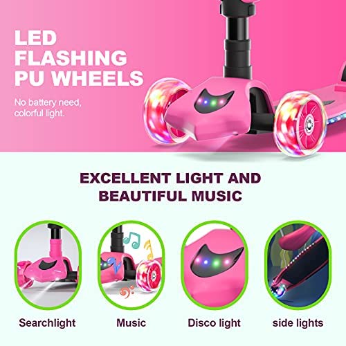 Toddle Scooter for Kids Kick Scooter with Foldable Scooter and Seat 3 Wheel Scooter 5CM Wide Light Up Wheels Mucic&Light Display Kids Scooter Rear Brake 4 Adjustble Height for Boys Girls Ages 3-12