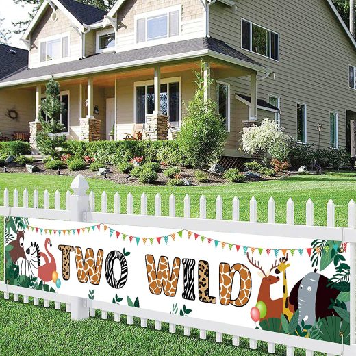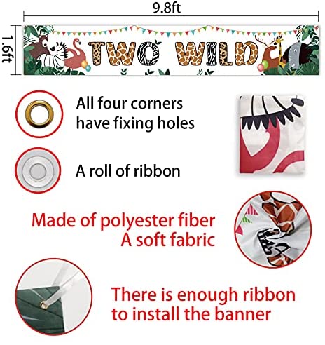Tow Wild Banner,Jungle Safari Wild Two Birthday Large Banner Backdrop 9.8X1.6 Ft,Animals Theme Party Sign for Boys Girls Second Birthday