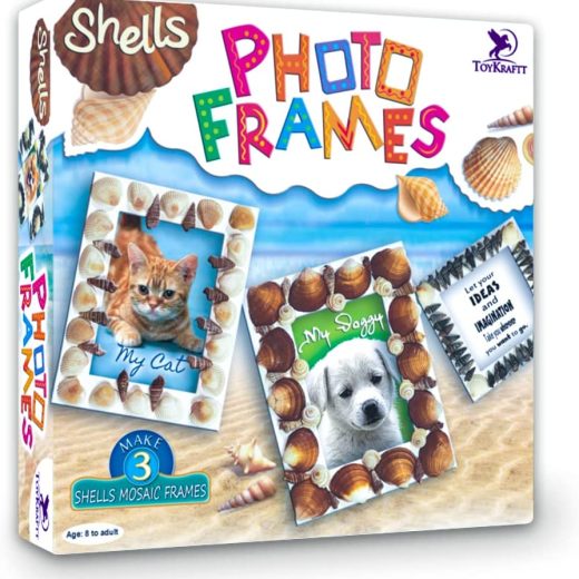ART & CRAFT with SHELLS – Another amazing art & craft kit from Toykraft. With this do-it-yourself kit, kids can spend hours of time creating beautiful mosaic photo frames using shells. WHAT’s INSIDE – This Toykraft Shell kit contains a very rich assortment of natural shells in different shape, size, colour and texture. A shell enthusiast can be wonderstruck by natures beauty in such diversity. The kit also contains 3 photo frame cut outs, rubberised magnets, adhesive and instruction manual. HOW DOES IT WORK – Using the adhesive provided in the kit the shells can be stuck to the photo frame cut outs to make these mini fridge magnets photo frames. The activity is not just very simple but also keeps children busy for hours. RECOMMENDED AGE – Minimum age for this activity is 8 years. Adults can also indulge in this superb art & craft activity, as the collection of shells is very exclusive and unique. The mini photo frames can adore your fridge or can be gifted to friends and family. GIFT IT – Great gifting option to kids of ages 8 and above as a kit. Finished articles are a great gift to all in the family!