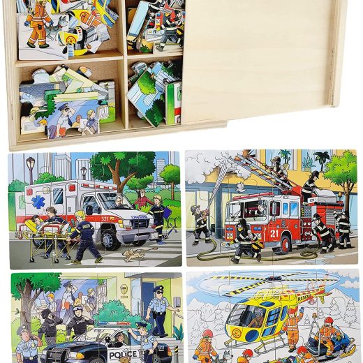TOYLI 4-IN-1 EMERGENCY VEHICLE WOODEN JIGSAW PUZZLES SET INCLUDES 4 12-piece puzzles featuring kids’ favorite emergency vehicles: Ambulance, Fire engine, Police, Rescue Helicopter. Improve essential skills and see the unique artwork when the puzzle is completed. SET COMES IN A STURDY WOODEN BOX for easy transport and store. Made of high quality wood, TOYLI Puzzles are thick and durable for repeated use by children. Smooth edges and soft corners make our Puzzles safe for children’ hands. HIGH QUALITY MATERIALS IS A TOP PRIORITY FOR TOYLI, so our 4-in-1 Vehicle Wooden Jigsaw Puzzle Set is 100% kid friendly, safe, BPA-free, and designed for 3-9 year old kids small hands to hold and operate. CPSIA & ASTM tested. HELP CHILDREN TO RAISE AN INTEREST AND LEARN about service emergency vehicles, create their imagination, creative spark, exploration and improve hand-eye coordination, practice problem-solving and spatial reasoning. Let children grow in the puzzle game with different artworks and create their own story. PACKAGING, UNIQUE APPEARANCE, AND ENDLESS PLAY will grab the attention of children for a long time. Kids will surely love this set on any occasion, and this makes the TOYLI 4-in-1 Vehicle Wooden Jigsaw Puzzles Set a perfect Birthday and Christmas gift for kids. Don’t hesitate and have a great time with kids!