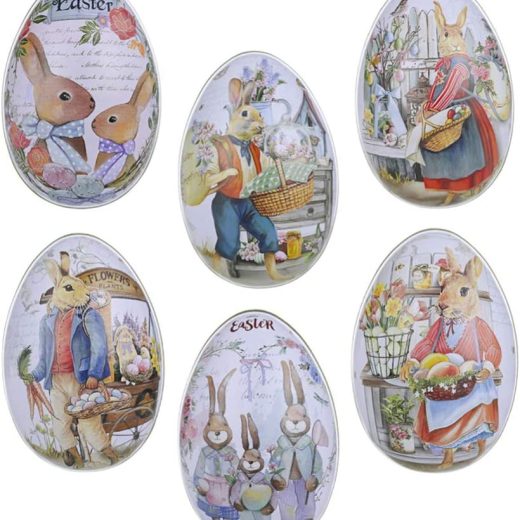 Feature- Color: Assorted Color;- Material: Tinplate;- Small Size: 6. 50X4. 50X5. 00cm;- Medium Size: 11. 00X6. 50X7. 00cm;- Large Size: 12. 50X8. 50X9. 00cm; Package Including 6pcs Easter Egg Tin Box Easter Bunny Metal Candy Box Fillable Easter Eggs Metal Empty Shells Basket Stuffers Toys for Kids Easter Egg Hunt Party Favors