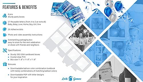 FUN PARTY DECORATIONS THAT LAST. These baby boxes with letters are perfect for 1st birthday balloons, baby shower or gender reveal decorations, and many more occasions you have on your calendar! 4 pre-folded baby balloon boxes come packed in a sturdy giftbox – easy to store for the next celebration or share with friends and neighbors. LIMITLESS COMBINATIONS FOR ALL CELEBRATIONS. One set of balloon decoration boxes includes 27 letters, plus an extra B letter to spell BABY, and also ONE, BDAY, XMAS, GIRL, BOY, LOVE, HOME. Unlike most other s, we not only include adhesive dots instead of adhesive letters so that you could use the letters multiple times. We also attach a special downloadable letter book, so you’ll never run out of them! VERSATILE FOR BOYS AND GIRLS. Our transparent boxes with letters can be used as baby shower decorations for both baby boy and baby girl. The baby decor boxes are loved by adults and kids and serve as an ideal party backdrop and prop for a photo booth. It has never been so easy to create a festive setup indoors or outdoors, backyard party or birthday picnic in the park. ONE LESS THING TO WORRY ABOUT BEFORE YOUR SPECIAL DAY. Be it party decorations, color matching, or background props, we have you covered. The assemble video and manual with high-quality pictures take one trouble away. The party balloon boxes come with a colorful PDF manual to provide you with trendy combinations of matching colors such as rose gold, pink and gold, or black and gold. LIFETIME GUARANTEE. We are responsible for making your party decorations stand out and serve multiple times. Try it yourself and you will know better! If for any reason you are not happy with our product, just send it back to us and we will refund you the full purchase price. No questions asked!