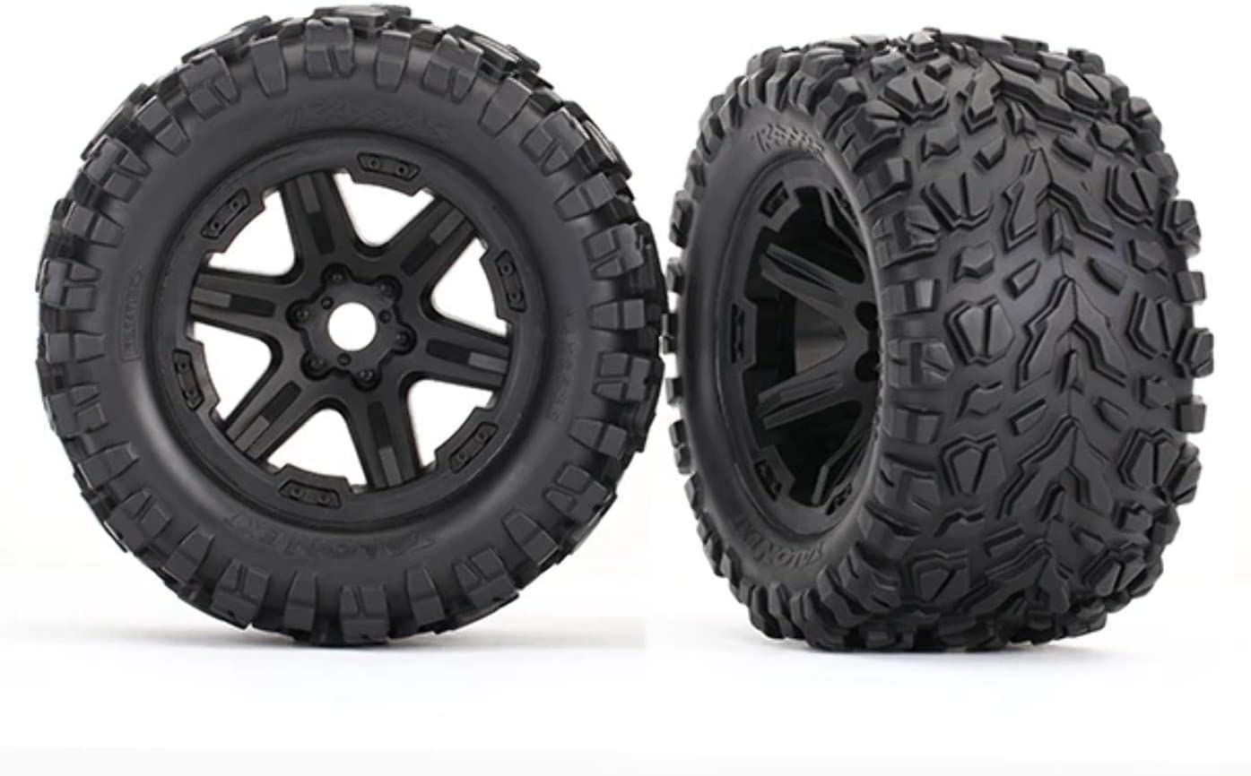 Traxxas 8672 3.8 black wheels (17mm hex) pre-mounted to Talon EXT tires (TSM rated). This product is made from high quality materials and designed for long-lasting performance. This is replacement hardware for use on Traxxas vehicles; consult your users manual for exact parts listings.
