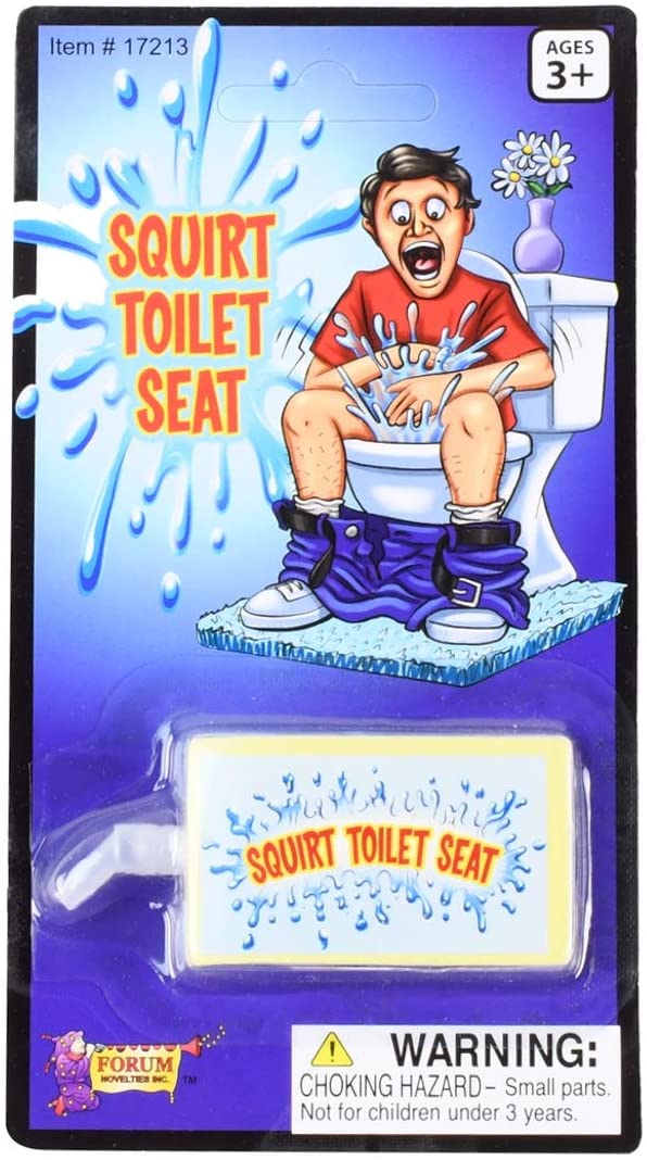 Squirt your way to a laugh when you place this novelty bathroom gag under a toilet seat. Fill up the squirter with water, place it on the toilet bowl and align it with the seat bumper, then set the seat and lid down. Make sure the nozzle faces inward and upward so this pranks recipient gets a wet surprise when he or she plunks down on the seat. Youll know the prank has worked when you hear the unsuspecting recipient scream or shout. Just peel off the included sticker on each side and use this funny toilet prank at work, school, or on a public toilet. Pull a prank at a party and wait for someone to run screaming out of the bathroom. Give this funny practical joke as a gag gift to friends or family members and get lots of laughs. Measuring approximately 3 3/4 long, 1 1/8 wide, and 1/2 thick, this toilet seat squirter makes the ultimate hidden prank. As with all our items, this funny joke ships new with our 100% customer satisfaction guarantee