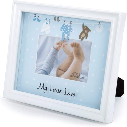 PHOTO SIZE: The frame holds a 4 x 6 photo MEASUREMENT: The overall frame measures 11.5”L x 1”W x 9.5”H in dimensions MATERIAL: Made of high-quality, durable and safe manufactured wood promises a long lifecycle DISPLAY: Comes with an easel backing for an easy horizontal countertop display, great way to cherish your favourite baby pictures on the coffee table, nightstand, shelf, or bathroom countertop DESIGN: Features a simple white frame with a cute blue matting, baby illustrations and a writing ‘My Little Love’ VERSATILE: Capture and proudly display the most treasured moments of your baby as they grow up