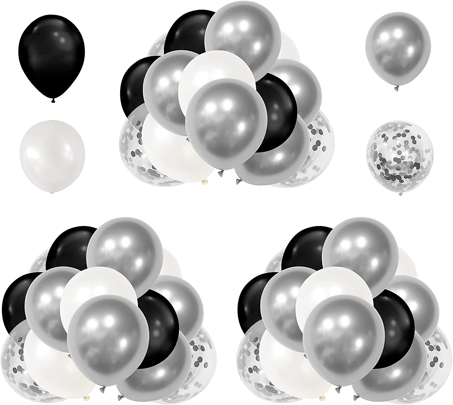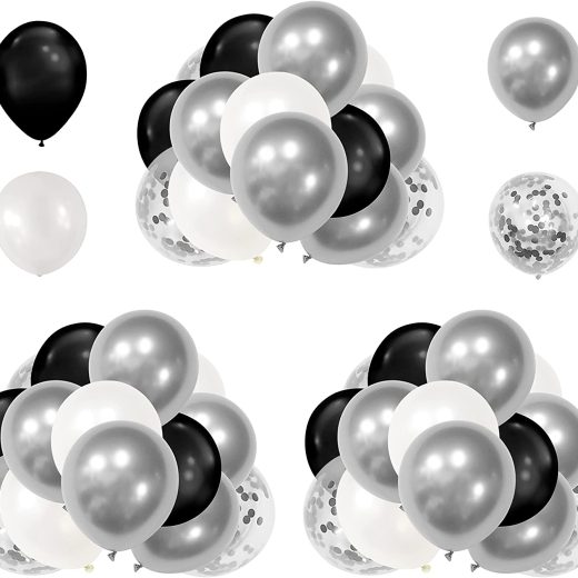 Package includes:25pcs silver chrome metallic balloons;25pcs silver confetti balloons;25pcs black latex balloons and 25pcs white latex balloons. Pr…