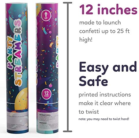 TWIST. POP. CELEBRATE. Celebrate your special events with confetti streamer cannons. Whether it’s a birthday, Christmas, New Years Eve, wedding, graduation, or any other celebration we want to make sure it’s amazing. Your party deserves the very best! NO MESS Every popper is packed with bright, easy to clean streamers, so you can celebrate with all your loved ones and be stress-free knowing there is minimal cleanup. CAPTURE LASTING MEMORIES. Our dazzling confetti streamers make for the most beautiful celebration pictures. Whether you are a photographer looking for confetti cannons effects for your shoot, or just trying to capture fantastic pictures to share and remember your event on social media, we’ve got the best cannons for you! The perfect indoor alternative to fireworks. EASY TO USE AIR POWER! Just a simple twist at the very bottom part of the cannon releases a beautiful display of multicolored confetti. Each cannon is built of a durable tube that is PACKED full of confetti for an exciting pop of confetti that flies up to 35 feet! 100% SATISFACTION GUARANTEE. Providing top quality products and top notch customer service is our #1 priority. Every order includes a full team dedicated to your satisfaction! If for any reason you are not fully satisfied, contact us and we will provide a full refund. Buy with confidence knowing that you’ve got the best confetti cannons backed by a lifetime money-back guarantee.