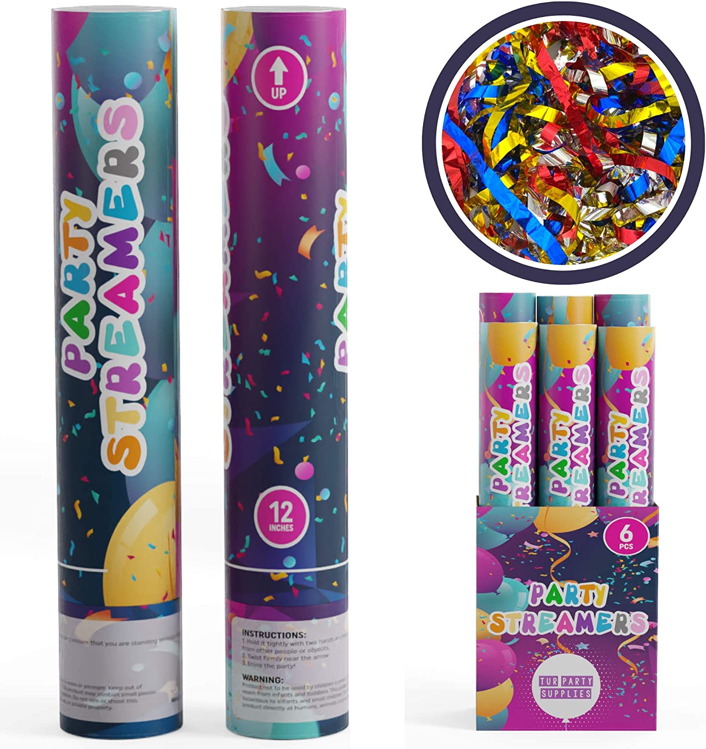 TUR Party Supplies No Mess! Large Streamer Confetti Cannons Party Poppers | Multicolor | Launch 35 ft | 12 in | New Years Eve, Birthdays, Graduations, All Celebrations (6 Count)
