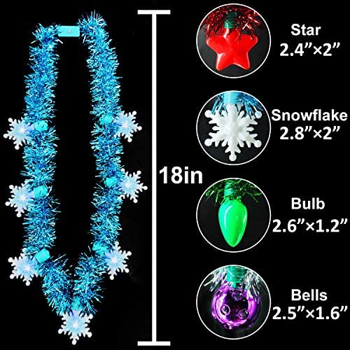 Ready for Christmas Party Fun 2021 NEWEST 4 Pack LED Light up Tinsel Sparkling Garland Necklaces for Kids Adults !!!Features:1. Red Tinsel Christmas Necklaces decorated with 7 Large 2.4 Red and Green Stars LED Light Up Bulbs. Measures 34inch. 2. Sliver Tinsel Christmas Necklaces decorated with 7 Large 2.5 blue, green, golden, red and purple Jingle Bells LED Light up. The Bells Necklace will makes vibrant voice when they shake. Measures 34inch. 3. Green Tinsel Christmas Necklaces decorated with 7 Large 2.6 LED Light up Bulbs featuring blue, green, yellow, red colors. Measures 34inch. 4. Blue Tinsel Christmas Necklaces decorated with 7 Large 2.6 LED Light up White Snowflakes Bulbs. Ultra bright with blue lighting colors. Measures 34inch. 5. There are 7 modes on it including slow blinking, fast flashing, multi -flash, blinking strobe to steady on, and turn off. 6. One Size Fit Most children, teens, kids and adults. You could share them with your family and friends.Package Include:1 x Red Tinsel Stars Necklace 1 x Sliver Tinsel Bells Necklace 1 x Green Tinsel Bulb Necklace 1 x Blue Tinsel Snowflakes Necklace Specifications:Material: PlasticSize: 36 or 34 inches in length.Each is 7 LED lights.Battery model: CR2 batteries(included& installed).