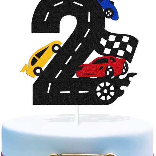 Two Fast Cake Topper 2nd Race Car Driver Checkered Racing Themed for Kids Boy Girl Second Happy Birthday Party Supplies Black Glitter Double Sided