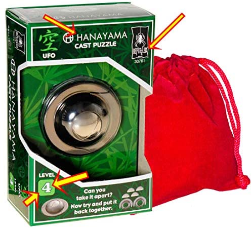 UFO Hanayama Brain Teaser Puzzle, New 2019 Release, Level 4 Difficulty Rating, RED Velveteen Drawstring Pouch, Bundled