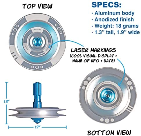 PRECISION MACHINED METAL SPINNING TOP: Each of our Aluminum models are made from aerospace-grade aluminum. Aluminum contains many unique properties including: corrosion resistant, durable, temperature resistant, low maintenance, attractive appearance, and environmentally friendly. Each UFO is precision CNC machined to a tolerance of 0.005”. Also, each top features a ceramic spin ball that is 8x harder than steel and nearly perfectly smooth. POST TREATMENT: After each piece is precision machined, anodizing and laser etching is performed. After anodizing a precision laser etches very fine details onto the top and bottom of the UFO. This precision is the size of a human hair 0.001”. These fine entails label the UFO with the name and UFO sighting date and provide unique details that highlight the uniqueness of the UFO. These details also create a visual display when spun. LONG SPINNING, PERFECTLY BALANCED: With some skill and practice each of the Triangulum aluminum models can achieve a spin time in excess of 4 minutes. The top feels like it will spin forever. After a short duration the top will enter hover mode – is when the top has achieved perfect balance. Once achieved it feels like the top is standing still or hovering. The machined dome allows for invert spins! FUN FOR EVERYONE: UFO Tops are fun for all ages, men, women, adults, children, teenagers, and just about everyone. They are pocket sized- roughly 2” wide and 1.5” talls. They are great in a backpack, in a drawer or on your desk near the keyboard and mouse. PERFECT FIDGET AND FOCUS TOY: UFO Tops are a fun analog toy that helps you reduce stress, and reduce your screen time. Many find tops relaxing, reduce stress and anxiety, and better emotional control. Also fun is spin competitions with friends and family. See who can spin the longest upright spin and then inverted or upside down spins. THE PERFECT, UNIQUE GIFT: UFO Tops are one of a kind, that comes through from the precision machining, laser etching, artwork and custom designed packaging which includes the UFO sighting artwork and the display window. You will have fun learning about the UFO sighting event that inspired the design and detail of your UFO Top.