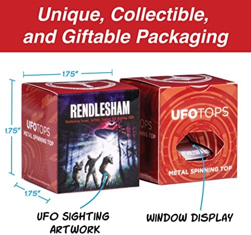 PRECISION MACHINED METAL SPINNING TOP: Each of our stainless steel models are made from food-grade stainless. Each UFO is precision CNC machined and features a ceramic spin ball that is 8x harder than steel and nearly perfectly smooth. POST TREATMENT: After each piece is precision machined, electroplating is performed for color and protection. After this a precision laser etches very fine details onto the top and bottom of the UFO. This precision is the size of a human hair 0.001”. These fine entails label the UFO with the name and UFO sighting date and provide unique details that highlight the uniqueness of the UFO. These details also create a visual display when spun. LONG SPINNING: PERFECTLY BALANCED: With some skill and practice each of the models can achieve a spin time in excess of 3 minutes. The top feels like it will spin forever. The machined dome allows for invert spins! FUN FOR EVERYONE: UFO Tops are fun for all ages, men, women, adults, children, teenagers, and just about everyone. They are pocket sized- roughly 3/4” wide and 1-½” tall. They are great in a backpack, in a drawer or on your desk near the keyboard and mouse. PERFECT FIDGET AND FOCUS TOY: UFO Tops are a fun analog toy that helps you reduce stress, and reduce your screen time. Many find tops relaxing, reduce stress and anxiety, and better emotional control. Also fun is spin competitions with friends and family. See who can spin the longest upright spin and then inverted or upside down spins. FUN, GIFTABLE PACKAGING: Each UFO Top includes a fun, full colored box with window cutout that displays the UFO. Also, custom artwork depicting the UFO sighting event is shown.