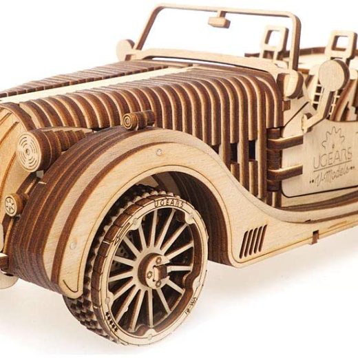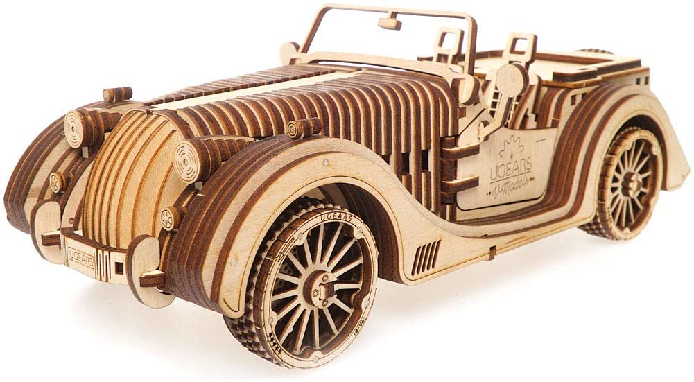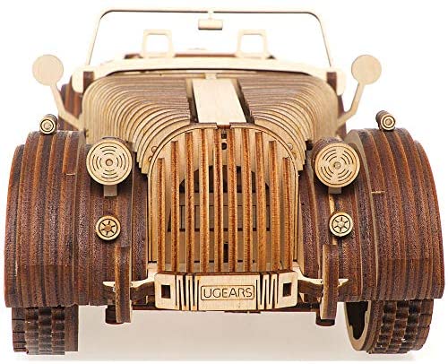 MECHANICAL MARVEL: Your adventure begins when you open the box with your new model kit from UGears. This is when you will experience the pleasant smell of natural wood that will stay with you all the way through the process of assembly, testing and play. Building the model is fascinating and exciting: with your own hands you will put plywood details together to create a 3-dimensional moving mechanical marvel TAKE IT FOR A TEST DRIVE: However, assembly is just a part of the fun: when the Roadster is finished you will definitely want to see what it is capable of and take it for a test-drive. Even when you get to the curb and are ready to put your model away, we would recommend to park it in a well-visible place in your house or office. Classic shapes and iconic Ugears design makes your Roadster a wonderful complement to any interior REALISTIC DESIGN: The unique charisma of the model comes from both its outstanding technical characteristics and detailed realistic retro-design. The clever combination of the plywood elements of different thickness 0.08 and 0.16 inches ensures that the motorcars body looks streamlined and clear. Open the hood to see the powerful V8 engine and watch the moving valves MOVING MECHANISM: Your sports car has a transmission that switches it in three modes: forward, back, and idle. The driving direction can be adjusted with the steering wheel. The suspension of the front wheels makes the Roadster look even more realistic. With a powerful rubber band motor, the car covers up to 13 feet in one winding CONSTRUCTION: The Roadster VM-01 model kit is made of sustainably sourced high grade wood and has everything you need for assembly. The quality of the parts is top-notch: a laser method is used for cutting items from a plywood board that provides precise hairline cuts