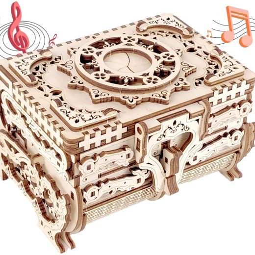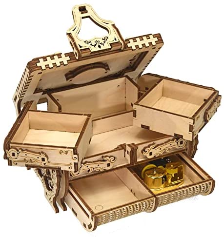 KEEPSAKE GIFT IDEAThe wood music box model already comes in an attractive package that will be awesome to give as a gift for Christmas, New Years Eve or Birthday! Our 3D wooden puzzles will always be a welcome gift and a worthy addition to any collection. BEAUTIFUL DESIGNElegant and stylish, 3D puzzle jewelry box has reliable structure with locking latch. It provides secure keeping of valuable items and prevents them of falling out and getting lost. The sides of the model are covered with exquisite floral carving with oriental elements. MECHANISMPull the upper lid to activate three main blocks: two of which are mirrored mechanisms on each side that move and turn the upper compartments. The third mechanical block moves the lower drawer in the middle of the Box. There is a ring box on the top of the treasure box DIY ASSEMBLINGMade of premium 4mm thickness birch plywood (not easily broken) by laser cutting technology, precise and clean. The wood is eco-friendly, safe, recyclable, manufactured from natural materials and no glue required to assemble them. Great Brain TeaserBuilding Antique Music Box model will stimulate your child’s ability to plan and build their own model like a true engineer. Brain teasers for adults and kids have never been so entertaining. Enjoy the fun to build a 3D puzzle piece by piece. The music ‘Castle In The Sky’ will be played.