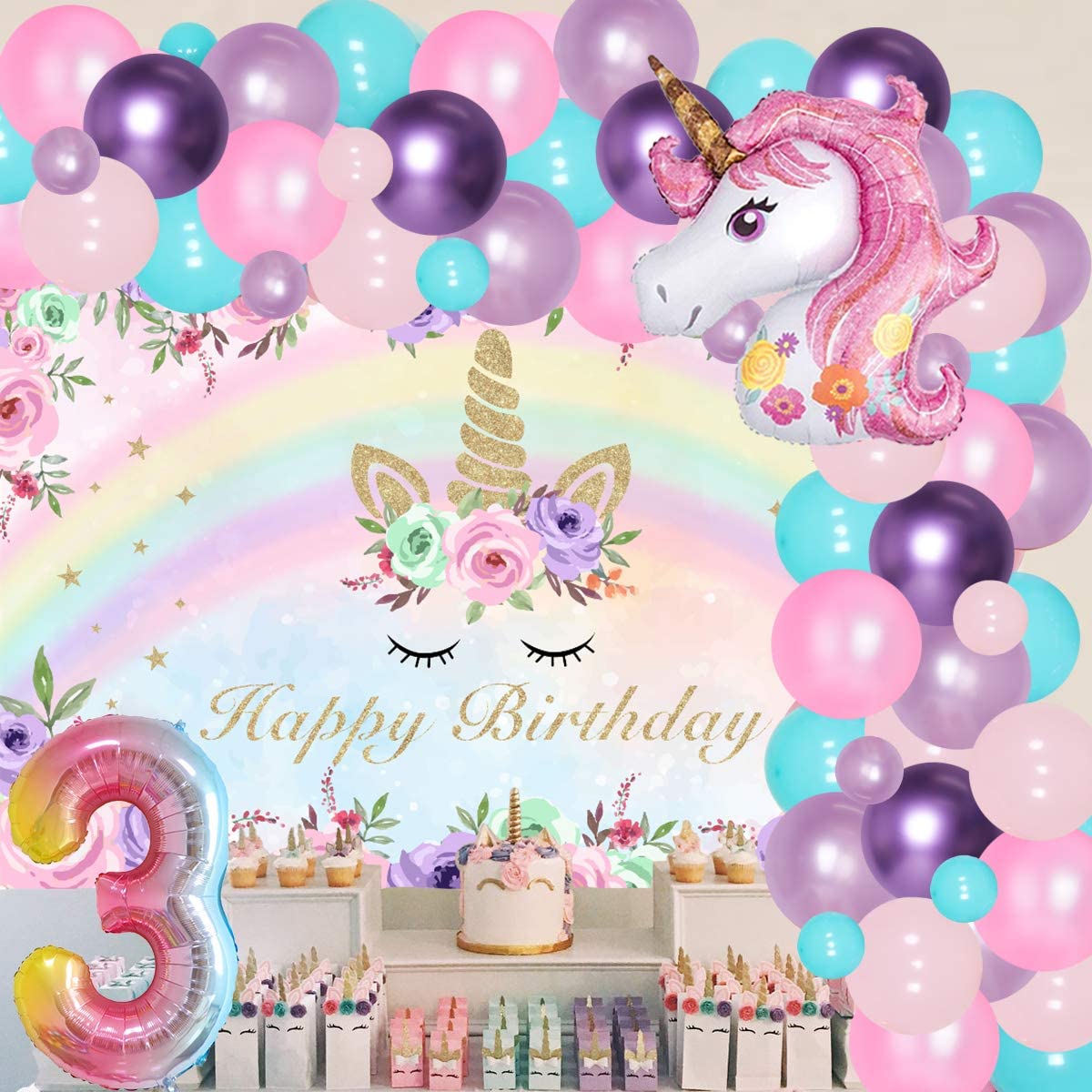 Unicorn 3rd Birthday Decorations for Girls Unicorn Birthday Backdrop Unicorn Balloon Garland Kit with Unicorn Number 3 Foil Balloons 3 Year Old Birthday Party Supplies