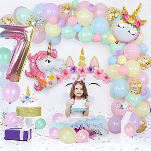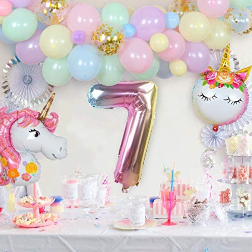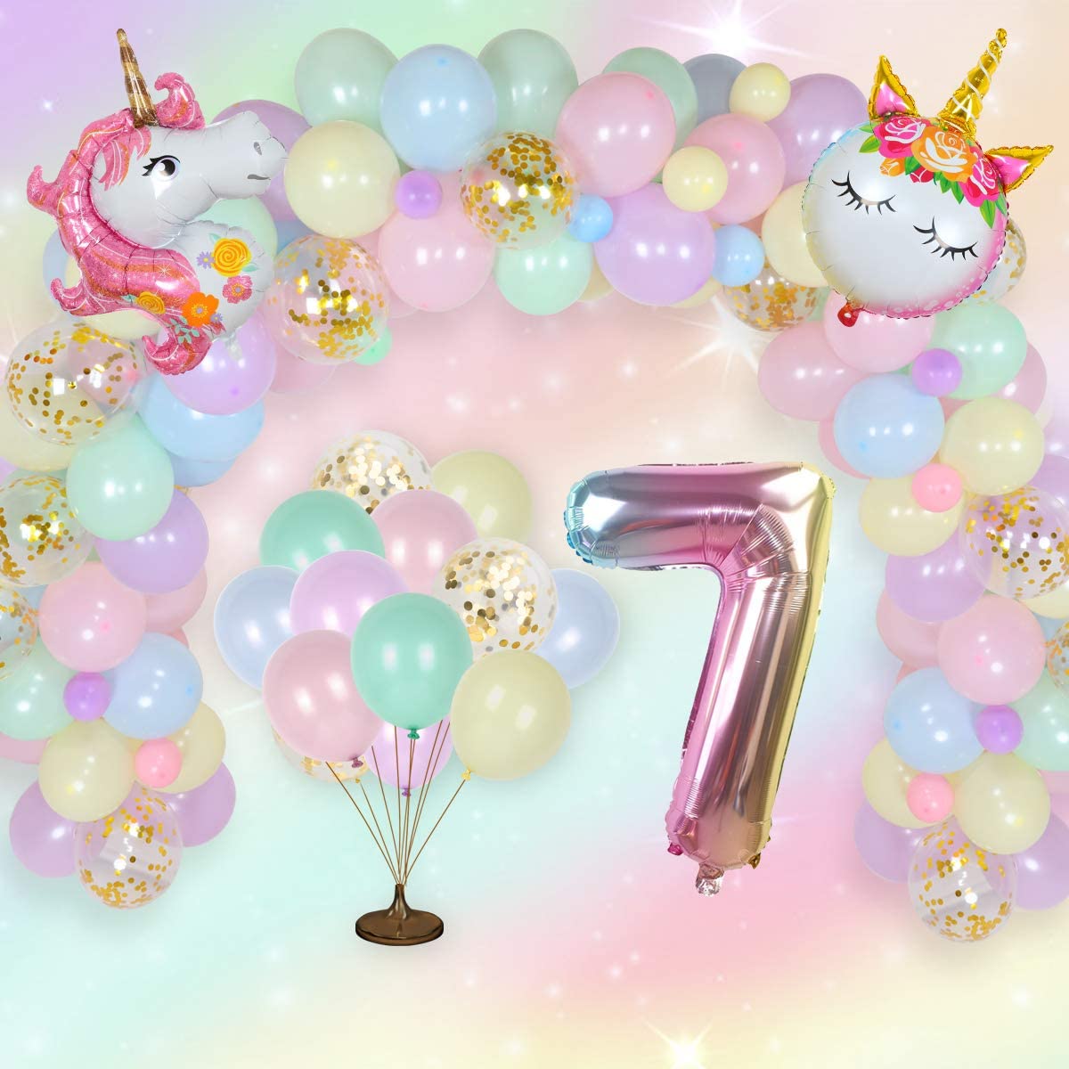 Unicorn 7th Birthday Decorations for Girls 7 Year Old, Rainbow Unicorn Balloon Arch Kit Pastel Unicorn Birthday Party Supplies 98 Pcs with Number 7 Foil Balloon