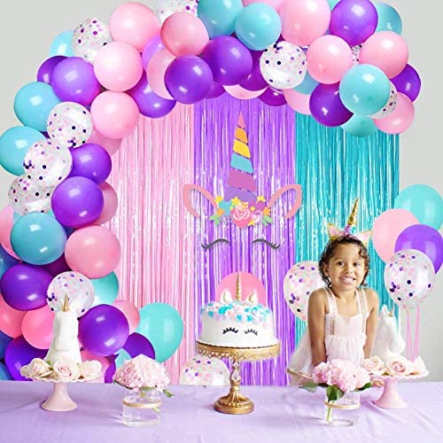 Unicorn Balloon Garland Kit with Light Purple Pink and Turquoise Balloons, Tinsel Curtain for Baby Shower Birthday Party Decorations Unicorn Party