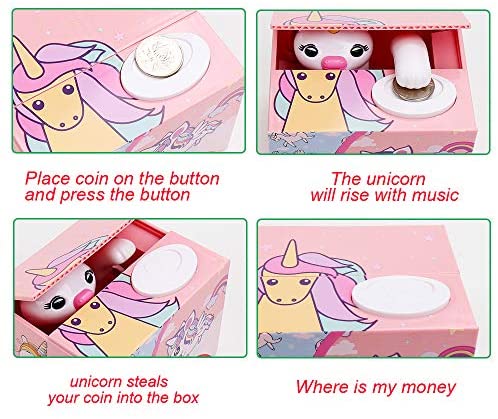 Lovely and Unique Design——The unicorn cartoon shape is very vivid and interesting, and it is rich in color, which can attract childrens attention. Just put the coin on the button and then touch the button, the unicorn will steal your coin secretly. Child-friendly Size and Capacity——The size of this piggy bank is 4.7*3.9*3.5 inch, suitable for most coins, and can hold about 30 or 40 coins. It can not only accompany children to grow up happily, but also cultivate their awareness of saving money from an early age, this will be a good start. Simple and Convenient Operation——This piggy bank requires 2* AA batteries (not included). Please put the battery into the slot below before use. You can easily open slot without screwdriver, and it is our unique design. Then turn on the switch, put the coin on the button, touch the button, and then the unicorn will reach out and steal the coin. You can easily take out the coin at the bottom. Widely Applicable——This piggy bank can be used not only as a gift for children to cultivate their financial consciousness from an early age, but also as an art of home decoration, allowing you to feel childlike in daily life and feel the beauty of life. Packaging and Service——1pcs*Unicorn piggy bank(Not included battery). If you have any questions or suggestions, please contact us in time, we will try our best to give you 100% satisfactory solution.