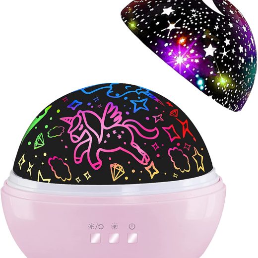 UNIQUE DESIGN — Unlike other products, our lamp bead does have last long lifetime. Can project up 15ft, 250 square feet of the house can see the clear pattern. Lights can be adjusted freely, the brightness of the light is not dazzling and will not affect the kids sleep. CHILD MODE PROJECTION LAMP– Covered with a dome cover, the starlight and unicorn projector can be used as a nightlight. The quiet star projector lamp will not be noisy, place it in your children room, helping to drive away darkness for them.so that it can help parents coax the baby fall into a deep sleep quickly. MULTIFUNCTION – THE Night Light has two modes, starry sky projection mode and night light mode. Starry sky projection mode can project a complete starry sky onto the walls and ceiling of your room. C button turns on or off the power, A button white light or rotates, B button various light combinations. INSTRUCTION — Now, as long as we have electricity, they can always illuminate the entire room. And in the rare occurrence when we dont have power, it can use batteries. Please note that the USB cable and the batteries cannot be used at the same time. Batteries are NOT included. BEST GIFTS — Best Gifts to your friends,your kids even yourself. This is not just a bedroom night light, the 360-degree rotating star lighting lamp is also an ideal decoration for the birthday party, festival celebration, wedding, and so on, helping to create a warm and romantic atmosphere.