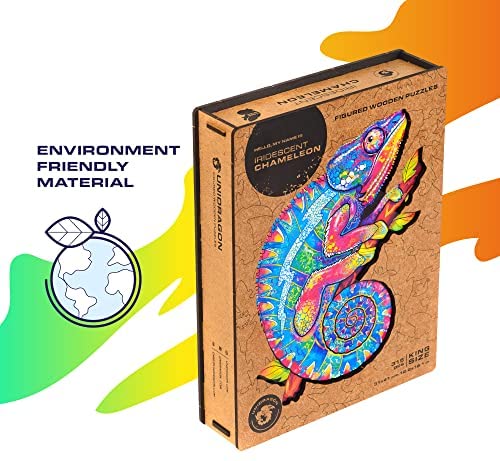 NATURE THEMED PUZZLE SET – Enjoy a relaxing time with this Iridescent Chameleon puzzle! Available in 3 sizes, our wooden jigsaw puzzles are made up of pieces shaped like forest animals and trees. GORGEOUS COLORS & DETAILS – Our product boasts rich print quality and intricate laser-cut pieces. When your wood puzzle is complete, you can hang it up on the living room as a classy decoration. FUN FOR ALL AGES – Let your kids train their problem solving and thinking skills with this wooden puzzle, or use it as a way to relieve stress after a long day at work. Its great for the whole family! A GIFT EVERYONE WILL LOVE – Looking for a thoughtful birthday or holiday present These wooden unique jigsaw puzzles are the perfect choice! Give your loved ones hours of entertainment. SATISFACTION ASSURED – Buy with confidence! Every purchase is backed by our 30 Day Money Back Guarantee. If there are any missing or damaged pieces, contact us for a full refund or replacement.