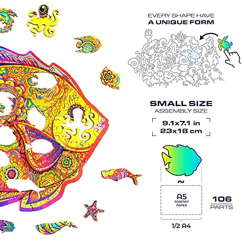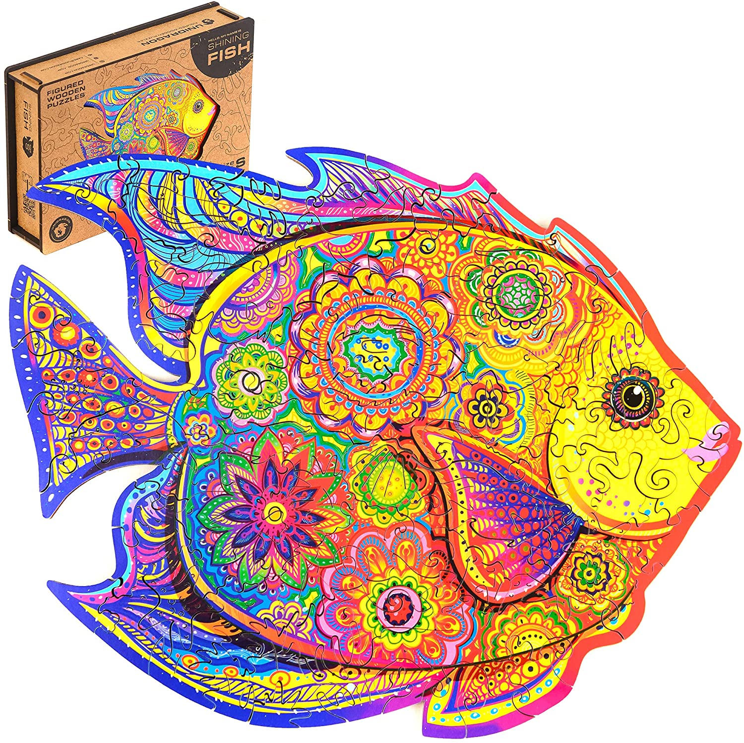 UNIDRAGON Wooden Jigsaw Puzzle, Best Gift for Adults and Kids, Unique Shape Jigsaw Pieces Shining Fish, 9.1 x 7.1 in (23 x 18 cm) 106 pcs, Small
