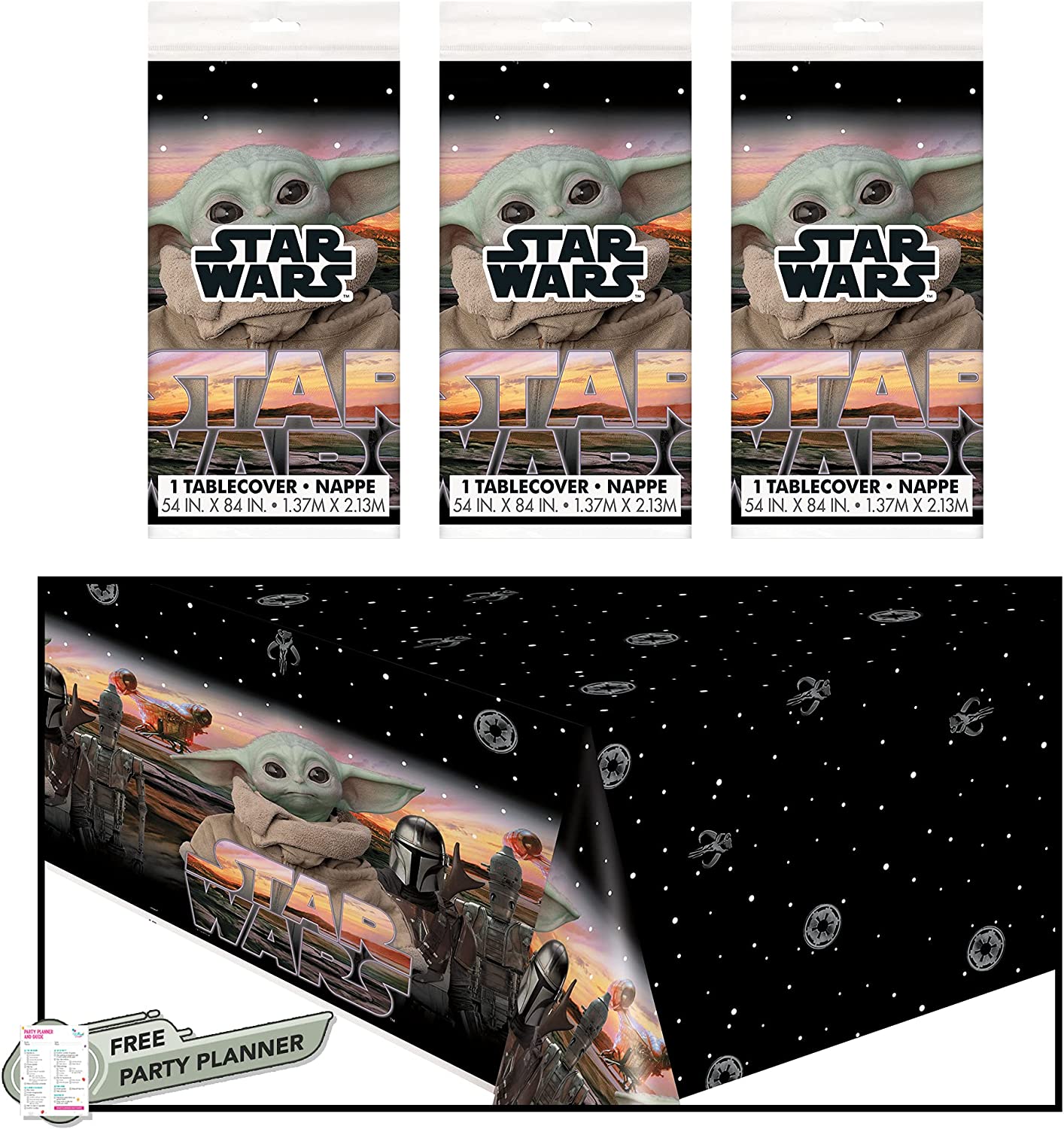MOVIE THEMED PARTY – These 3 count Star Wars table covers feature The Child – Bab Yoda – and the Mandalorian on a stunning black space background. Our high-quality graphics and vibrant colors will help you throw an exciting party. BIRTHDAY DECORATIONS – Includes 3 iddentical table covers in a Mandalorian Baby Yoda theme. Made of plastic, they can be wiped clean and stored for your next event. Includes a Free Party Planner! DÉCOR FOR ANY EVENT -These tablec overs are perfect for a birthday party or classroon party with kids who love the fictional movies and series of Star Wars. ICONIC CHARACTERS – These table covers showcase some of the most iconic Star Wars characters like Baby Yoda! SATISFACTION GUARANTEED – Or your money back!