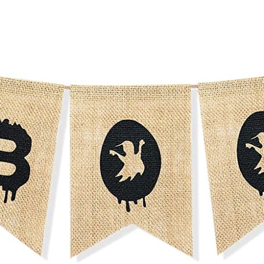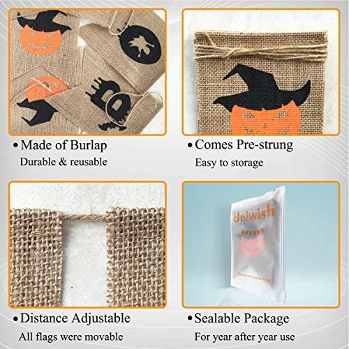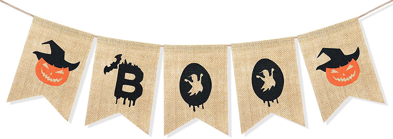 Burlap CONVENIENT TO USE – Pre-strung, no assembled required PERFECT SIZE – Each flag measure 5 x 7 inch with 6.6 feet rope ready to hang anywhere CUTE DESIGN – Combined with 3 kinds of patterns, pumpkin with wizard cap, bat, ghost sign, adorable to make your parties more attractive HALLOWEEN DECOR – Fit for quick Halloween decorating, both indoor and outdoor use, most atmospheres for scary scenes and so on VERSATILE – Hang at the entrance of your events, on the wall, over the porch or on the hallway to welcome the trick-or-treaters