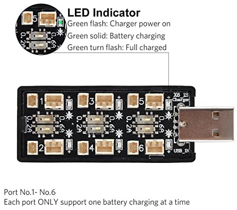 Charger plug: Micro 1.25 and JST-PH 2.0, AKA mCX and mCPX, Charging max 6 batteries at the same time. ( Need to consider width of battery)