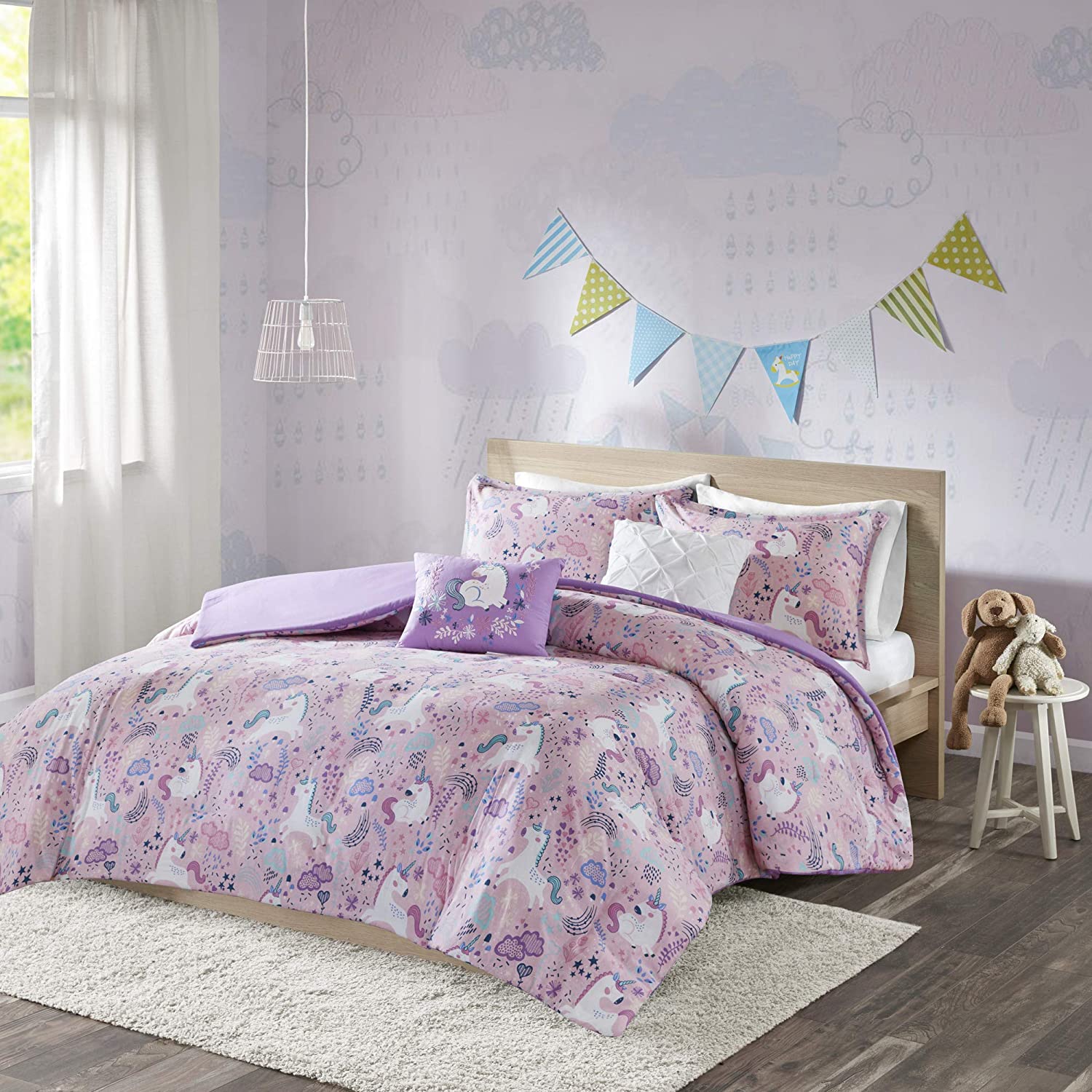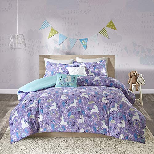Urban Habitat Kids Duvet Set Vibrant Fun and Playful Unicorn Print All Season Comforter Cover Matching Shams, Decorative Pillow, Children Bedding, Girls Bedroom Décor, Twin/Twin XL, Purple 4 Piece