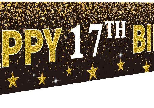 Ushinemi Happy 17th Birthday Banner Party Decorations, 17 Years Old Birthday Backdrop, Cheer to 17th Year Anniversary Large Signs, 9.8X1.6Ft, Gold and Black