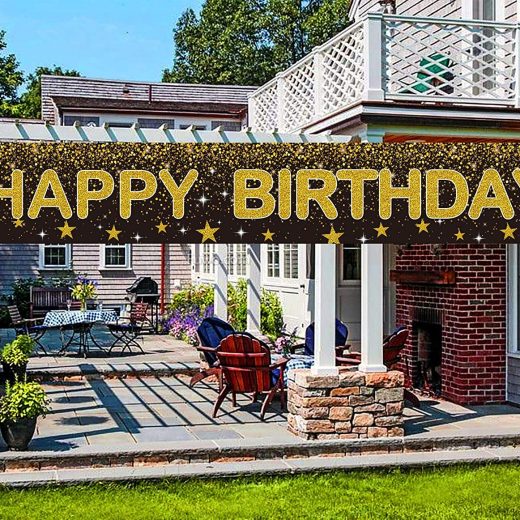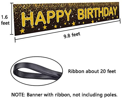 Happy Birthday Banner, Size: 9.8 x 1.6 feet, A hit for your birthday party, Perfect for tenth party decorations Large Birthday Party Decorations, Banner Material: durable and reusable polyester fabric, high quality and great price Unique Design, Shiny gold HAPPY BIRTHDAY letters, beautiful star confetti make a deep Impression on you, Make a wonderful photography backdrop Black and Gold happy birthday banner, Cheer to 10th 13th 16th 18th 21st 30th 40th 50th 60th years old birthday make a deep Impression on you Easy to use, Birthday banner with 20 feet ribbon, you can hang it on any place your want