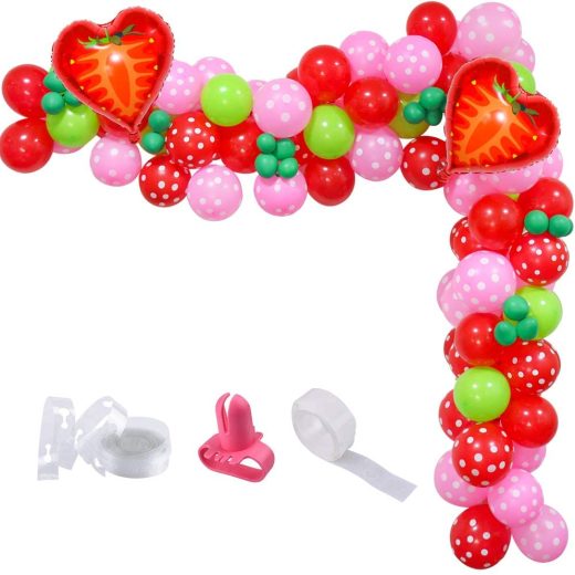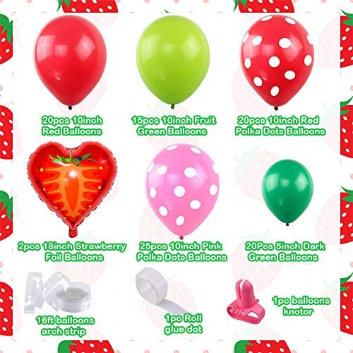 Strawberry Garland Kit SuppliesThis pack include 102pcs balloons,20pcs 10inch Red Balloons;15pcs 10inch Fruit Green Balloons;25pcs 10inch Pink Polka Dots Balloons;20pcs 10inch Red Polka Dots Balloons;20Pcs 5inch Dark Green Balloons; 2pcs 18inch Strawberry Foil Balloons;1pc balloons knotor, 1pc 16ft balloons arch strip, 1roll glue dot. Strawberry Theme Party DecorationsWe selected the super cute strawberry pattern balloons to make this balloon arch ,our sweet berry balloon garland kit with strawberry color latex balloons and strawberry foil balloons is prefect for your strawberry theme party, baby shower, summer fruit party and berry first birthday party. Vibrant Color And High Quality This bright strawberry themed balloon garland are made of natural latex, the colors are eye catching and the material are certificated non-toxic and are safe to use. Balloons support helium or air, please inflate right gas according your decorations need.,and we suggest not fully inflate balloons, also avoid direct sunlight. Easy DIY and AssembleHere comes with a whole balloon strip kit,help you make balloon garland or arch easier. a full set of party balloons set , string balloons up with balloon strip to decorate your party, Just take 30 minutes to put all of balloons together,and hang it up as a party backdrop, you can mix and match as you wish. Satisfaction Guarantee We have used high quality balloons and other products in the kit.You would be issued FULL REFUND guarantee if you are not satisfied with the balloons set. Go ahead and enjoy the party with your family and friends.