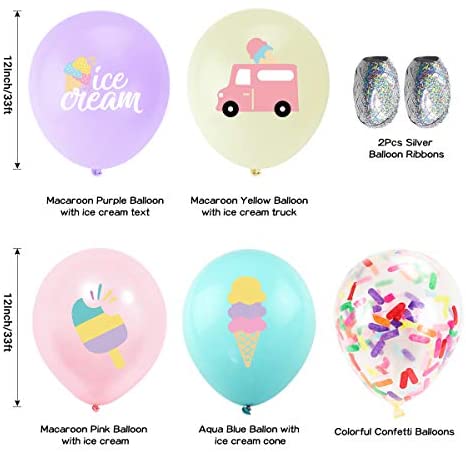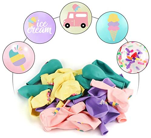 50pcs Ice Cream Balloons5 kinds of 12” latex print balloons. Package include 10pcs aqua blue Balloons with ice cream cone, 10pcs macarone pink Balloons with ice cream, 10pcs macarone yellow Balloons with ice cream truck, 10pcs macarone yellow with ice cream text, 10pcs Sprinkles Confetti Balloons,a nice combination for you to decorate your ice cream theme party. Ice Cream theme Party Decorations These bright and lively colorful ice cream balloons will create great fun in kids parties! Multicolored ice cream balloons are a perfect match for the ice cream theme.Ideal for ice cream birthday party,birthday party for kids, popsicle party, pool party,beach party,baby shower,Hawaii or kids first birthday. Non-toxic & Safe & High Quality These sweet ice cream party balloons made of natural latex, safe and durable, safe for children. Balloons with thick latex quality, never easy burst. Usage & Tips These multi-colored ice cream balloons can be filled with air and helium. These long-lasting helium balloons filled with AIR will stay full for up to 70 hours, while with HELIUM will stay full for 3-4 hours. 100% Satisfaction GuranteedWe are very confident with the quality of our balloons for we used quality materials. Its production process is being monitored to secure its quality, you are covered with 100% money back guarantee.