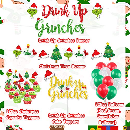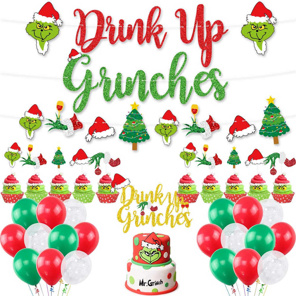 Premium Value Grinches Pack1*Drink Up Grinches Banner;1* Grinch element Garland Banner;1* Drink Up Grinches Cake Topper;12pcs* Christmas cupcake topper;30Pcs balloons(10 x red balloons, 10 x green balloons, 10 x snowflake balloons).All the decorations are designed to perfectly matches Christmas Grinches Party. Grinches Themed Party DecorThis Drink Up Grinches Decorations set will create a full christmas holiday season feeling and warm atmosphere to your Christmas themed party,Perfect for Christmas Party Decorations,Grinches Party Decor,Xmas Party Supplies,most atmosphere for christmas party,decorative use in Christmas Party or New Year Eve party. Unique Christmas DesignThe Grinchmas Party Decorations set feature glitter red and green color words, Christmas hats, and grinch wearing a christmas hat at both side. The Drink Up Grinches Cake Topper features gold glitter words with christmas element design.Perfectly tie in your Grinchmas naughty or nice party. Pre-Assembled and Easy DecorationThe drink up grinches banner and christmas element banner was already assembrated, save your time when you decorate your party, These cute christmas cake topper are delicate accessory for cupcakes, cakes, ice cream, meat, cheese and any dish you want to dress up.These colorful balloons will create great fun in kids parties! Premium High Quality MaterialThis christmas party kit are made from top quality glittered cardstock that is durable and strong and always attached to new food-safe toothpicks or lollipop sticks.These christmas party balloons made of natural latex, safe and durable,balloons with thick latex quality, never easy burst.