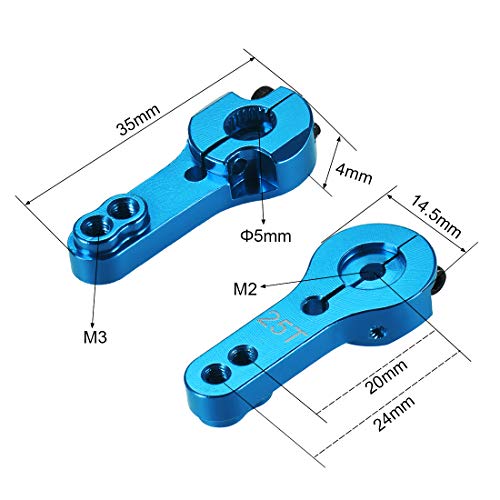 25 Thread Spline & M3 thread & 2 clamp system to adjustable.Suitable for mostly 25T Standard Servo Motor,such as Futaba,Savox,Xcore,HL,HSP,HD Power,Go Tech.For vehicle type : for RC, Buggy, Car, Truck, Truggy, Airplane, Bomber. Specifications2 clamp system with M3 threadMaterial: AluminumHead Hole Thread: M2Arm Hole Thread: M3Head Central Small Hole Diameter: 2.5mmHead Big Hole Diameter(Teeth Side): 5mmHead Big Hole Diameter(Back of Teeth Side): 7mmMaximum Thickness: 6mmMinimum Thickness: 4mmMaximum Width: 14.5mmTotal Length: 35mmDistance from hole center to hole center:20mm,24mmColor: Blue Package Content:1pcs x Aluminum Servo Arm2pcs x M2 Screw
