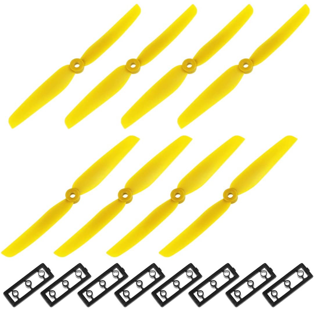 Feature:Works well with the following motors: All 2204 and 2206 motors.Widely used for 280 and 250 sized racers like: QAV250, HK250, Walkera 250, FPV250, Blackouts and other multirotor, quadcopter and hexacopter. NOTE:Accessories only, package does NOT contain any aircraft model.Please carefully check the Rotating Diameter and Pitch of your product to make sure it is perfectly compatible with your RC plane motor. Specification:Color: YellowMaterial: PlasticVane Quantity: 2Diameter: 6 inchPitch: 3 inchHole Diameter: 5mmThickness: 6mm Package Contents:4 x Clockwise RC Propellers4 x Counter-Clockwise RC Propellers8 x Hole Adapters