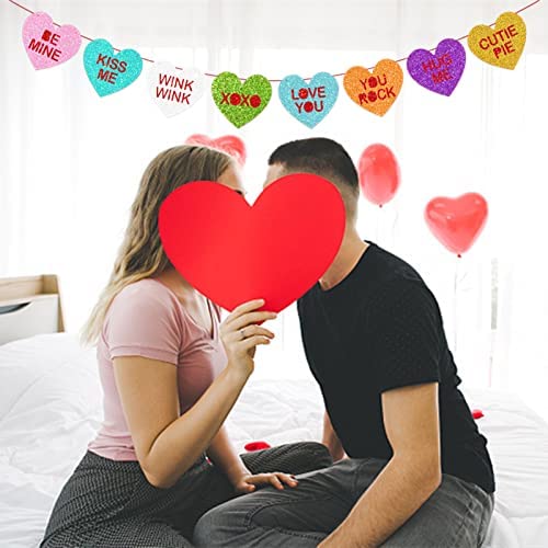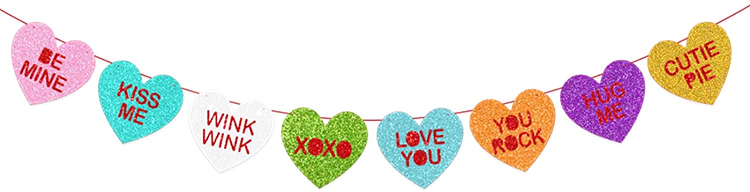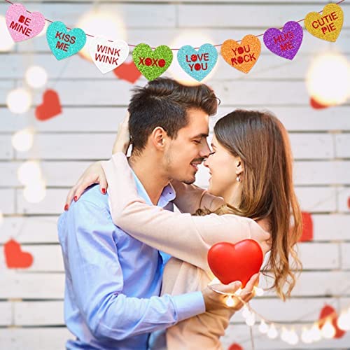 Valentines Day Conversation Hearts Banner, Glittery Candy Hearts Banner Valentines Day Decorations Banners Wedding Anniversary Engagement Banners Garland Photo Props Banner for Party Home Decor (Multicolor)
