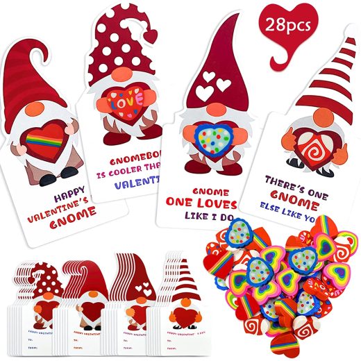 Valentines Day Gifts Cards for Kids, 28 PACK Gnome Valentine Card Set with Heart Erasers, Valentines Greeting Cards with Adhesive Dots, Valentine Day Exchange Cards for Girls Boys School Classroom Gifts Party Favors